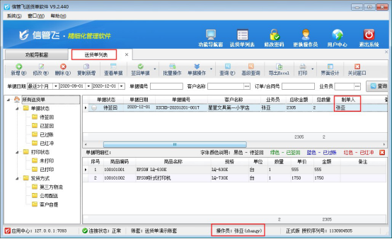 使用“系統(tǒng)管理員”登錄軟件,在送貨單列表中可以查看到所有人開的單據(jù)(系統(tǒng)管理員默認(rèn)有所有權(quán)限)。如下圖所示: