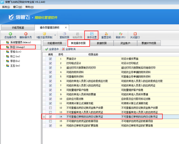 在功能導航窗點擊“系統管理”→“操作員及授權”即可進入“操作員管理及授權”界面,選中操作員賬號,然后在“其他操作權限”界面將“不可查看已審核的出納日記賬憑證”權限勾選上,如下圖所示,設置操作員賬號“張亞”不可查看已審核的出納日記賬憑證。
