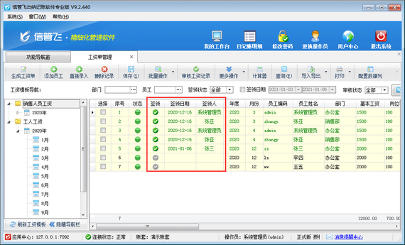 信管飛出納記賬軟件專業版包括工資管理功能,支持自定義工資模板,可根據設置的工資模板快速生成工資單,支持從上月工資單復制工資項目數據,每月工資發放后,可將工資記錄標記為簽領狀態,如下圖所示,本文介紹一下出納記賬軟件中如何標記工資記錄為已簽領狀態?