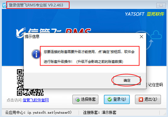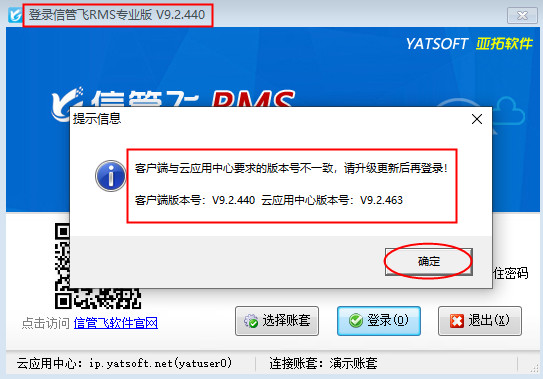 有些用戶登錄云賬套時,系統提示“客戶端與云應用中心要求的版本號不一致,請升級更新后再登錄!”如下圖1所示,登錄時之所以會提示升級版本,是因為亞拓軟件自主研發的軟件是不斷升級優化的,發布新版本后,云賬套模式的客戶端需要和云應用中心的版本一致才可以登錄,下面我們以信管飛RMS專業版為例,介紹下如何升級到最新版本軟件?