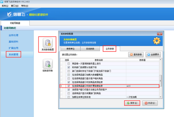 在功能導(dǎo)航窗點(diǎn)擊“系統(tǒng)管理”—》“系統(tǒng)參數(shù)設(shè)置”—》“業(yè)務(wù)參數(shù)”可以進(jìn)入到“業(yè)務(wù)參數(shù)”配置界面,在數(shù)據(jù)選擇參數(shù)內(nèi)打勾啟用“在選擇商品窗口可按擴(kuò)展信息檢索”參數(shù),并設(shè)置參數(shù)值(擴(kuò)展信息字段名),默認(rèn)為“ext1(擴(kuò)展信息1)”,如下圖所示。