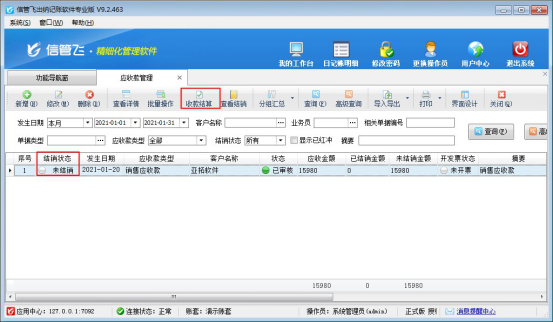 在功能導航窗點擊“往來管理”—》“應收款管理”進入應收款管理界面,在應收款管理界面選擇未結銷的應收款,點擊工具欄的“收款結算”進行收款操作,如下圖所示: