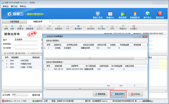 打開銷售出庫單界面,然后在工具欄點擊“更多操作”—》“查看應(yīng)收款及結(jié)銷情況”,彈出應(yīng)收應(yīng)付及結(jié)銷情況窗口,在此窗口點擊“查看結(jié)算單”可以打開本單據(jù)應(yīng)收款相關(guān)的收款結(jié)算單界面,如下圖所示: