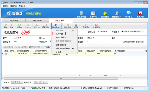 收款結(jié)算單打開后,關(guān)閉“應(yīng)收應(yīng)付及結(jié)銷情況”窗口,在收款結(jié)算單界面工具欄“更多操作”下選擇“紅沖單據(jù)”,紅沖收款結(jié)算單,收款結(jié)算單紅沖后,銷售出庫單應(yīng)收款結(jié)銷狀態(tài)更新為“未結(jié)銷”,然后即可反審修改銷售出庫單,如下圖所示:
