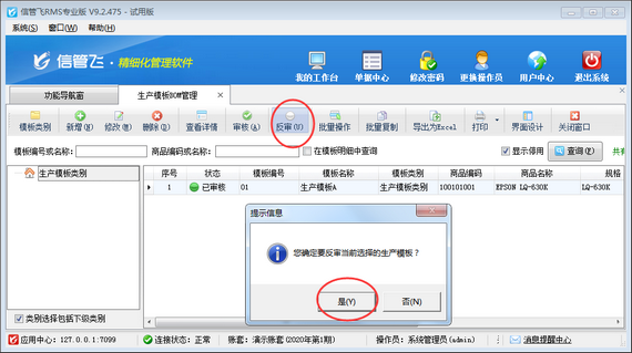 在生產(chǎn)模板BOM管理界面,選擇一個已審核的生產(chǎn)模板,在工具欄中點擊“反審”按鈕,系統(tǒng)彈出提示信息“您確定要反審當前選擇的生產(chǎn)模板?”,然后點擊“是”按鈕對已審核的生產(chǎn)模板進行反審操作,如下圖所示。