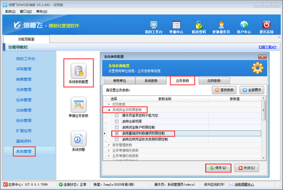 在功能導航窗選擇“系統管理”—》“系統參數配置”—》“業務參數”,進入業務參數設置界面,在“系統安全及權限參數”中勾選“啟用基礎資料數據項權限控制”參數,然后保存參數配置,如下圖所示。