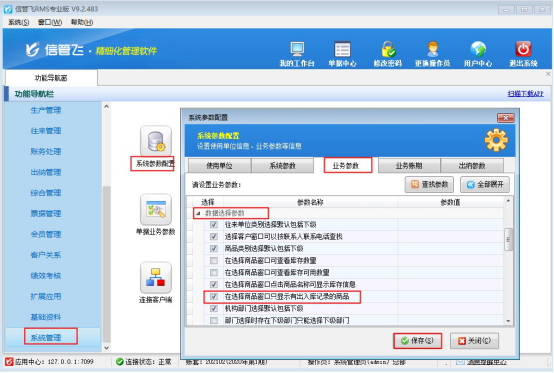 在功能導航窗點擊“系統管理”—》“系統參數”,選擇“業務參數”中數據選擇參數打開,勾選參數“在選擇商品窗口只顯示有出入庫記錄的商品”保存配置,如下圖所示: