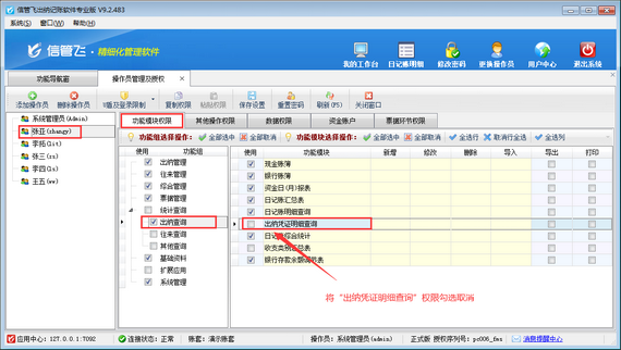 在功能導航窗點擊“系統(tǒng)管理”—》“操作員及授權(quán)”,進入“操作員管理及授權(quán)”界面,選擇操作員“張亞”,在其右側(cè)的功能模塊權(quán)限內(nèi)選擇“出納查詢”模塊,將出納憑證明細查詢的“使用”權(quán)限勾選取消,然后保存設置,如下圖所示: