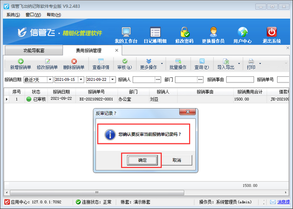 在功能導航窗點擊“綜合管理”—》“費用報銷管理”打開費用報銷管理界面,選擇一個已審核的費用報銷單,然后在工具欄點擊“更多操作”—》“反審報銷單”,系統會彈出提示信息“您確認要反審當前報銷單記錄嗎?”,點擊“確定”按鈕即可對已審核的費用報銷單進行反審操作,反審后,費用報銷單狀態變為“待審核”,此時可以對這個待審核的費用報銷單進行修改操作,如下圖所示。