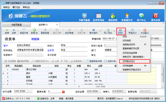 在功能導航窗點擊“新開送貨單”,新增保存一個單據,在打印按鈕下點擊打印格式設計,可進入打印格式設計界面。如下圖所示: