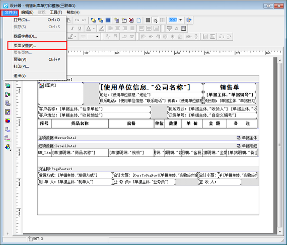 在打印格式設計界面,選擇打印格式模板點擊“設計格式”,進入打印格式設計器界面。在模板設計器中點擊左上角“文件”,彈出的界面上點擊“頁面設置”,進入頁面設置界面,如下圖所示: