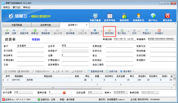 操作員權限設置完成后,選擇操作員“張亞”登錄軟件,打開一個送貨單,然后可以看到送貨單界面工具欄已查看不到“附件資料”功能,操作員將無法再查看附件資料。