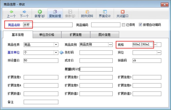 參數(shù)啟用保存后,在“基礎(chǔ)資料”—》“商品信息”中可添加商品,在規(guī)格中可區(qū)別開規(guī)格內(nèi)容,示例商品:水杯(規(guī)格500ml和350ml),如下圖所示