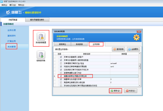 本文以“信管飛送貨單軟件”為例,示范如何設(shè)置送貨單必須通過引單生成。在功能導(dǎo)航窗選擇“系統(tǒng)管理”—》“系統(tǒng)參數(shù)配置”,在業(yè)務(wù)參數(shù)的“業(yè)務(wù)單據(jù)相關(guān)參數(shù)”中勾選啟用參數(shù)“銷售出庫(kù)單必須通過引單生成”,保存參數(shù)配置,如下圖所示: