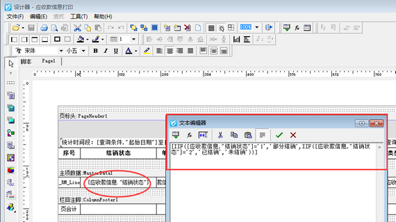 在應收款管理界面點擊“打印”—》“打印格式設計”—》“設計格式”打開模板設計器,將結銷狀態調用內容更換為函數:[IIF([應收款信息."結銷狀態"]='1','部分結銷',IIF([應收款信息."結銷狀態"]='2','已結銷','未結銷'))],如下圖所示。