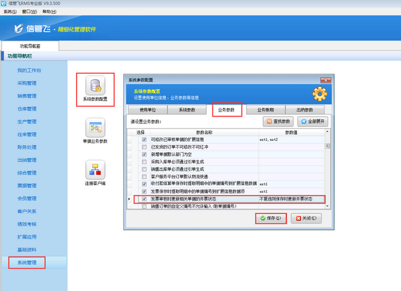 系統默認發票保存時更新業務單據的開票狀態,如需設置發票審核后更新業務單據的開票狀態,可在功能導航窗點擊“系統管理”—》“系統參數設置”—》“業務參數”中找到并啟用參數“發票審核時更新相關單據的開票狀態”(不啟用則發票保存時更新相關單據的開票狀態),如下圖所示。