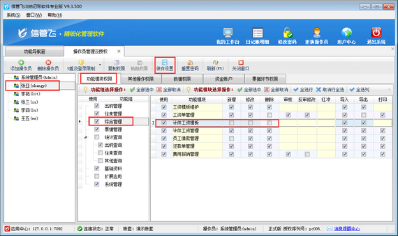 在功能導航窗點擊“系統管理”—》“操作員及授權”,打開操作員管理及授權界面,選擇操作員“張亞”,在其右側的功能模塊權限內選擇“綜合管理”模塊,將“計件工資模板”的“新增、修改、刪除”權限勾選取消,然后保存設置,如下圖所示。