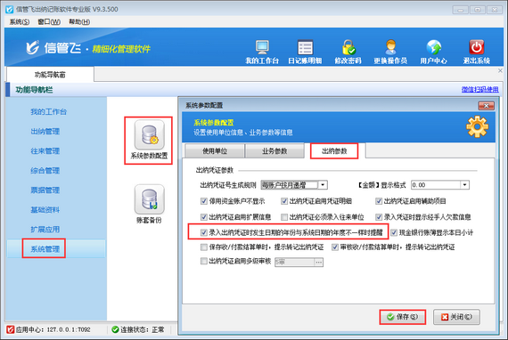在功能導航窗點擊“系統管理”—》“系統參數配置”,在“出納參數”界面勾選“錄入出納憑證時發生日期的年份與系統日期的年度不一樣時提醒”參數,然后點擊“保存”按鈕保存參數配置。