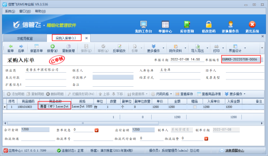 系統參數設置完成后,新增一張采購入庫單,入庫商品“惠普(HP)LaserJet 1020”采購價1200元,如下圖所示: