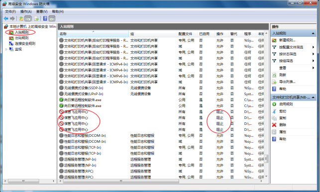 打開(kāi)“控制面板”→“系統(tǒng)和安全”→“Windows防火墻”→“高級(jí)設(shè)置”→“入站規(guī)則”,把被阻止的應(yīng)用服務(wù)程序刪除掉,然后重新添加端口到防火墻即可。
