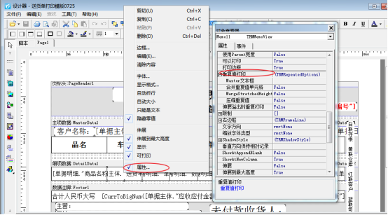 在送貨單開單界面,點擊打印按鈕下的“打印格式設(shè)計”,選擇此模板,點擊“設(shè)計格式”進入模板設(shè)計器界面。在模板設(shè)計器中,把送貨車號對應(yīng)的明細數(shù)據(jù)項文本框右鍵屬性打開,把重復(fù)值打印下“合并重復(fù)單元格和壓縮重復(fù)值”改為“TRUE”,然后保存模板,如下圖所示: