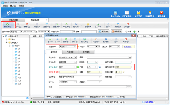 如登記日記賬時選擇的是外幣賬戶,新增憑證信息窗口可自動顯示“匯率”及“(本位幣)金額”信息,錄入原幣金額后,系統可自動計算本位幣金額。