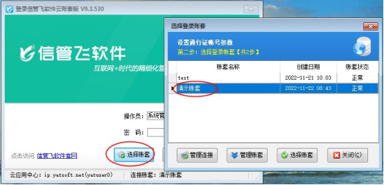 打開云賬套登錄界面,點擊“選擇賬套”,繼續點擊下一步進入選擇登錄賬套界面,如下圖所示: