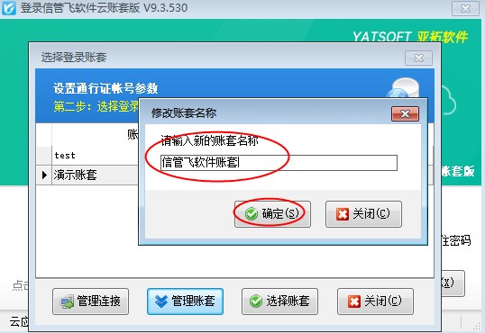 選擇賬套“演示賬套”,點擊“管理賬套”下的“修改賬套”,可彈出修改賬套界面,輸入“新賬套名稱”,點擊確定,如下圖所示: