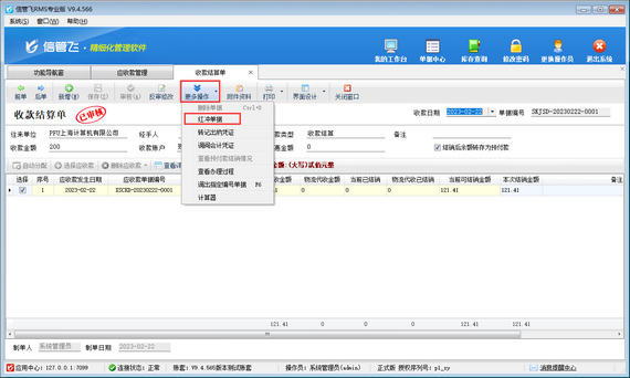 在收款結算單界面工具欄點擊“更多操作”—》“紅沖單據”,紅沖收款結算單,收款結算單紅沖后,在工具欄點擊“更多操作”—》“刪除單據”,可將此收款結算單刪除,如下圖所示。