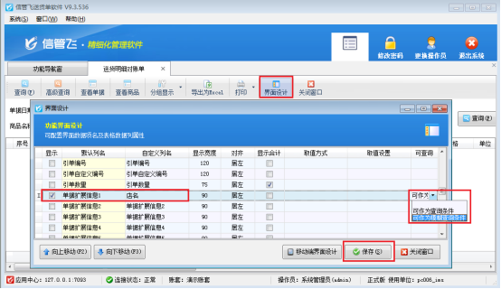 功能導航窗選擇“業務處理”在右側的查詢統計下打開“送貨明細對賬單”進入送貨單明細查詢界面,點擊“界面設計”按鈕,在打開的界面設計窗口中找到“擴展信息1”數據項,勾選顯示并在可查詢處設置“可作為模糊查詢條件”,然后保存設置,如下圖所示: