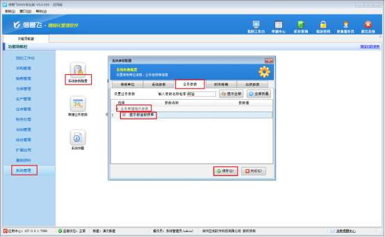 功能導航欄點擊“系統(tǒng)管理”-》“系統(tǒng)參數(shù)配置”,進入系統(tǒng)參數(shù)配置界面,業(yè)務參數(shù)界面業(yè)務單據(jù)相關(guān)參數(shù)下勾選參數(shù)“顯示報溢報損單”,勾選之后點擊保存。