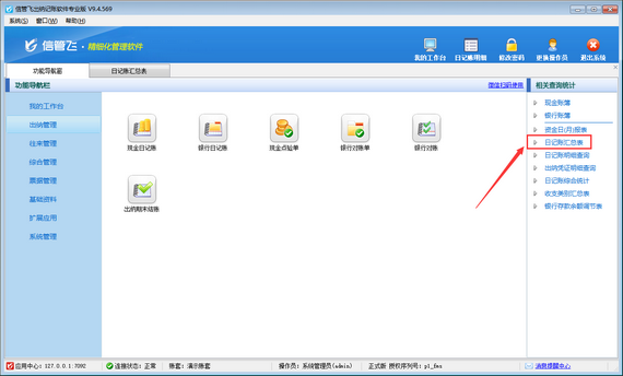 在功能導航窗點擊“出納管理”,右側相關查詢統計下,點擊“日記賬匯總表”打開日記賬匯總表統計查詢界面,如下圖所示。