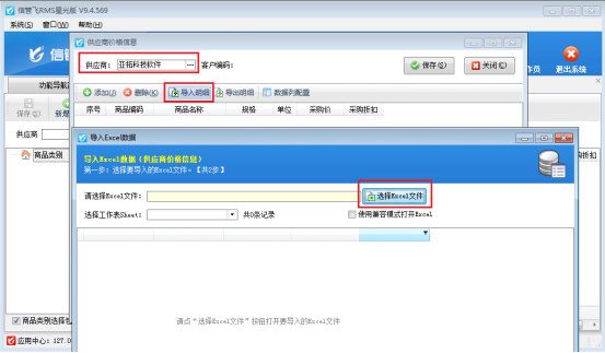 在供應商價格信息界面,選擇供應商,點擊導入明細,選擇導入的Excel文件,如下圖所示: