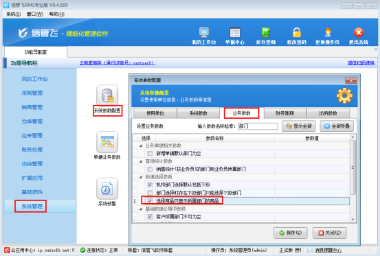 軟件默認不按部門顯示商品,需要按部門顯示需啟用參數(shù)配置,功能導(dǎo)航窗點擊“系統(tǒng)管理”—“系統(tǒng)參數(shù)配置”,點擊業(yè)務(wù)參數(shù),勾選參數(shù)“選擇商品只顯示所屬部門的商品”并保存配置,如下圖所示: