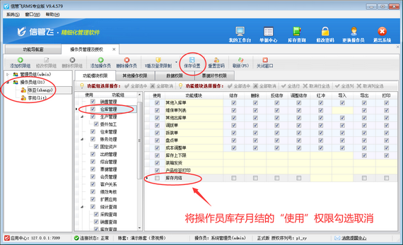 登錄軟件,在功能導(dǎo)航窗點(diǎn)擊“系統(tǒng)管理”—》“操作員及授權(quán)”,進(jìn)入“操作員管理及授權(quán)”界面,選擇操作員“張亞”,在其右側(cè)的功能模塊權(quán)限內(nèi)選擇“倉(cāng)庫(kù)管理”,將庫(kù)存月結(jié)的“使用”權(quán)限勾選取消,然后保存設(shè)置,如下圖所示。
