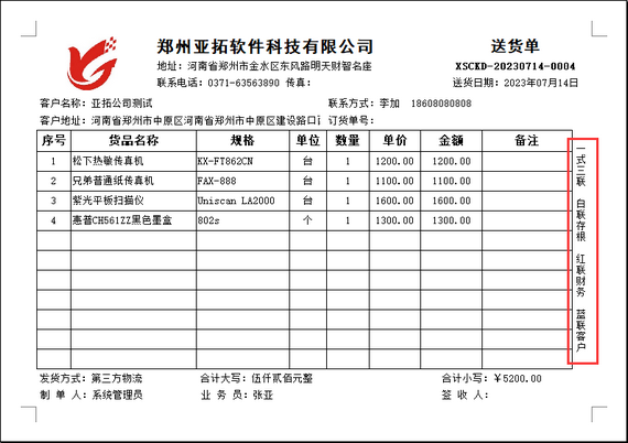 送貨單一般情況下是一式三聯(lián)(存根聯(lián)、財務聯(lián)、客戶聯(lián)),如下圖所示。有用戶需要打印一式二聯(lián)、一式四聯(lián)或者一式五聯(lián),需要修改送貨單右側多聯(lián)單用途備注。軟件支持自定義修改,本文介紹一下操作方法。