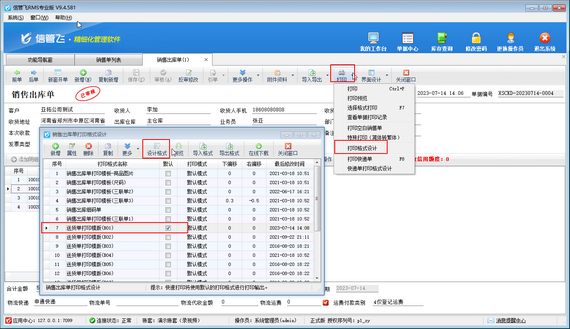 打開一個銷售出庫單,在單據(jù)界面工具欄點擊“打印”—》“打印格式設計”,在打開的打印格式設計窗口選擇需要調整的打印格式模板,然后點擊“設計格式”進入模板設計器,如下圖所示。