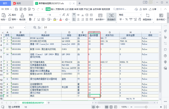 導(dǎo)出Excel文件后,修改表頭文本“庫存數(shù)量”為“盤點(diǎn)數(shù)量”,然后修改對應(yīng)商品的盤點(diǎn)數(shù)量。如下圖所示: