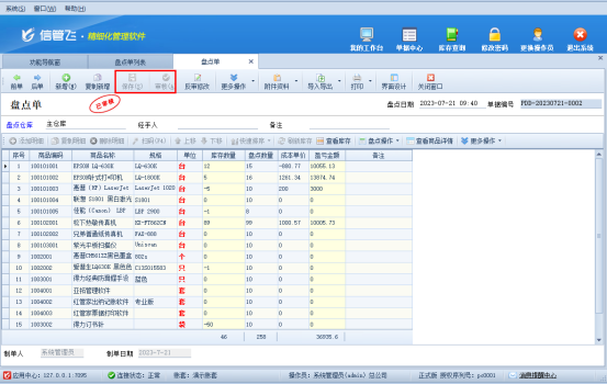 Excel文件中盤點(diǎn)數(shù)量修改完成,保存Excel并關(guān)閉界面,軟件中打開倉庫管理—盤點(diǎn)單,在盤點(diǎn)單列表上點(diǎn)擊“新增”按鈕,進(jìn)入盤點(diǎn)單新增界面,選擇盤點(diǎn)倉庫“主倉庫”,點(diǎn)擊“從Excel導(dǎo)入明細(xì)”選擇Excel文件進(jìn)行導(dǎo)入,導(dǎo)入后保存審核盤點(diǎn)單(盤點(diǎn)單審核前需要軟件中出入庫單據(jù)已審核完成),如下圖所示: