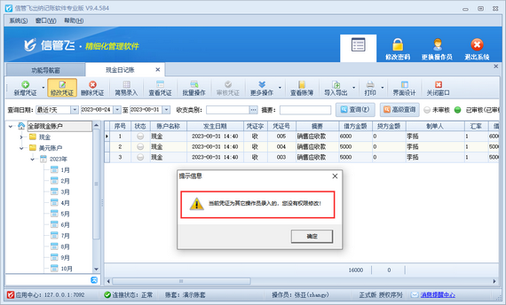 有用戶在修改出納日記賬憑證時,會遇到無法修改的情況,系統彈出提示信息“當前憑證為其他操作員錄入的,您沒有權限修改!”,如下圖所示。