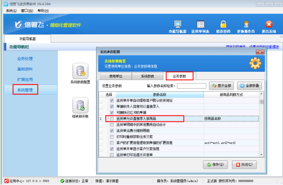 權(quán)限設(shè)置后保存設(shè)置,在“系統(tǒng)管理”—系統(tǒng)參數(shù)配置中“業(yè)務(wù)參數(shù)”,取消勾選參數(shù)“送貨單允許直接錄入新商品”并保存參數(shù),如下圖所示: