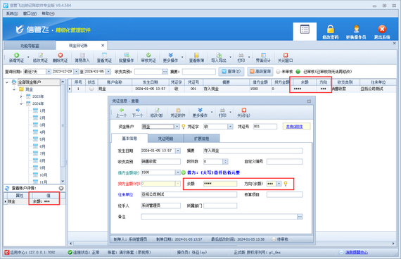 出納記賬軟件支持設置多個操作員賬號并對操作員賬號設置權限,有用戶登錄軟件無法查看出納日記賬資金賬戶余額,如下圖所示: