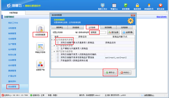 在功能導(dǎo)航窗點擊“系統(tǒng)管理”—》“系統(tǒng)參數(shù)配置”—》“業(yè)務(wù)參數(shù)”,即可進入到“業(yè)務(wù)參數(shù)”配置界面,在業(yè)務(wù)單據(jù)相關(guān)參數(shù)內(nèi)取消勾選“采購及銷售開單允許直接錄入新商品”參數(shù),然后點擊“保存”按鈕保存設(shè)置,如下圖所示:
