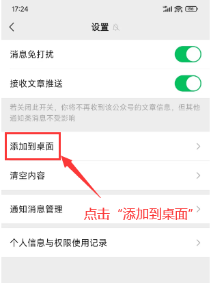 點擊“添加到桌面”,就可以將“信管飛軟件”公眾號的快捷方式添加到手機系統(tǒng)桌面上啦。