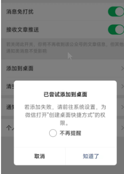 如果添加失敗,請打開手機系統(tǒng)設(shè)置,然后為微信打開“創(chuàng)建桌面快捷方式”的權(quán)限即可,如下圖所示。