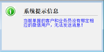 信管飛RMS、信管飛出納記賬軟件、信管飛送貨單軟件均支持微信消息增值服務(wù)功能,部分用戶在開單保存單據(jù)時(shí)會出現(xiàn)以下提示:“當(dāng)前單據(jù)的客戶和業(yè)務(wù)員沒有綁定相應(yīng)的微信用戶,無法發(fā)送”,如圖: