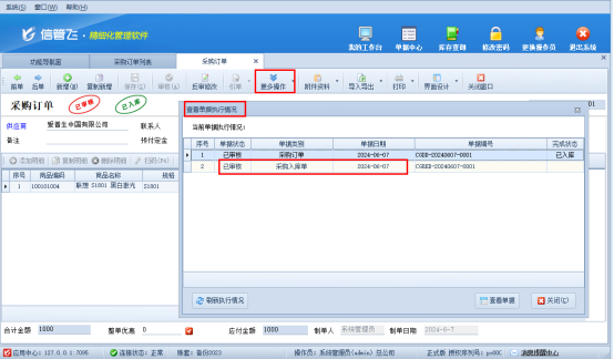 有兩種方式進(jìn)行查看,一種是采購(gòu)訂單界面查看。打開(kāi)采購(gòu)訂單界面,在工具欄“更多操作”下點(diǎn)擊“查看訂單執(zhí)行情況”,彈出界面可以查看采購(gòu)入庫(kù)單的單據(jù)日期,如下圖所示: