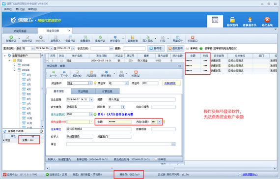 在資金賬戶余額管理方面,信管飛出納記賬軟件提供了嚴格的權限控制。企業可以設定特定操作員無法查看資金賬戶余額,從而有效防止敏感信息的泄露。這樣的設計不僅保護了企業的財務隱私,也增強了企業內部的信任與協作。