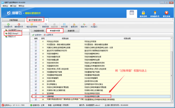 出現(xiàn)此問題的原因是:當前登錄的操作員賬號沒有過賬單據(jù)的權(quán)限,解決方法如下:使用系統(tǒng)管理員賬號登錄軟件,在功能導(dǎo)航窗點擊“系統(tǒng)管理”—》“操作員及授權(quán)”打開操作員管理及授權(quán)界面,選擇操作員賬號,在“其他操作權(quán)限”界面將“過賬單據(jù)”權(quán)限勾選上,然后保存權(quán)限設(shè)置,如下圖所示。