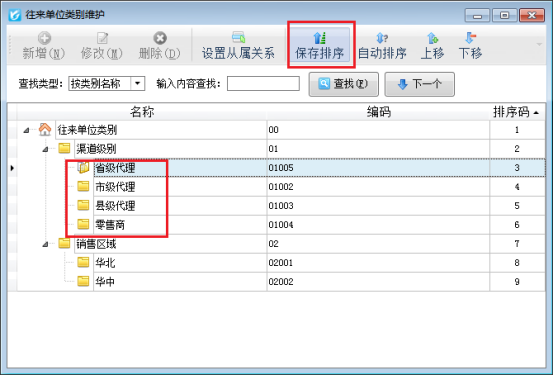 功能導航窗點“基礎資料”—》“客戶信息”即可進入“客戶信息”界面,工具欄點“單位類別”進入往來單位類別維護界面,點“設置排序”按鈕,可進行排序,點“自動排序”會按照編碼自動進行排序;點“上移”、“下移”按鈕可向上、向下調整顯示位置,如圖所示。